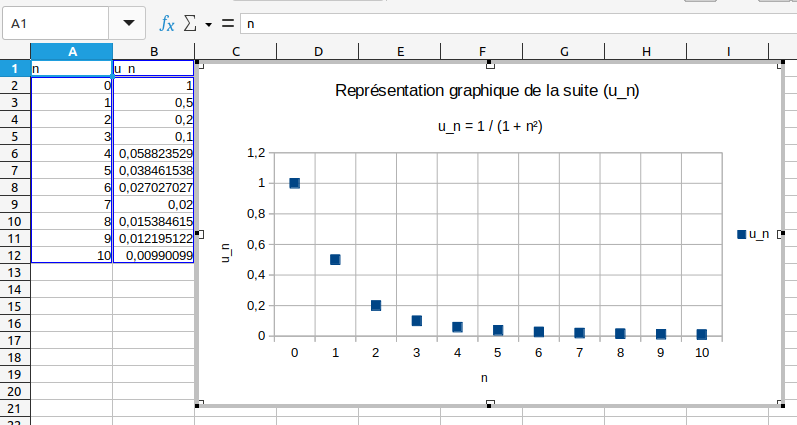 = f(A1)dans la caseB1, puis d'étirer vers le bas. On remplacerafpar la fonction de son choix... - Ici, on représente la suite avec \(u_n = \dfrac1{1+n^2}\)
