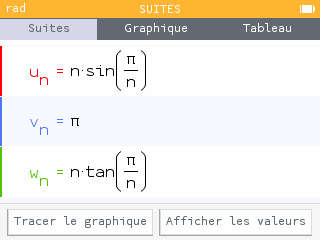 Pour \(n>2\) et \(x=\dfrac{\pi}n\) qui est un angle aigu en radian, on a \(\sin\left(\dfrac{\pi}n\right) < \dfrac{\pi}n < \tan\left(\dfrac{\pi}n\right)\).